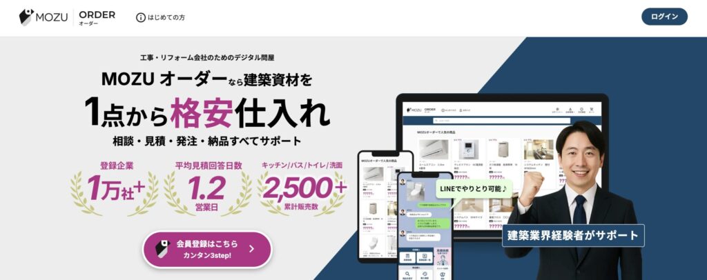 MOZUオーダーは、建築資材の仕入れを効率化したい工事会社や職人限定で提供されているデジタル問屋です。